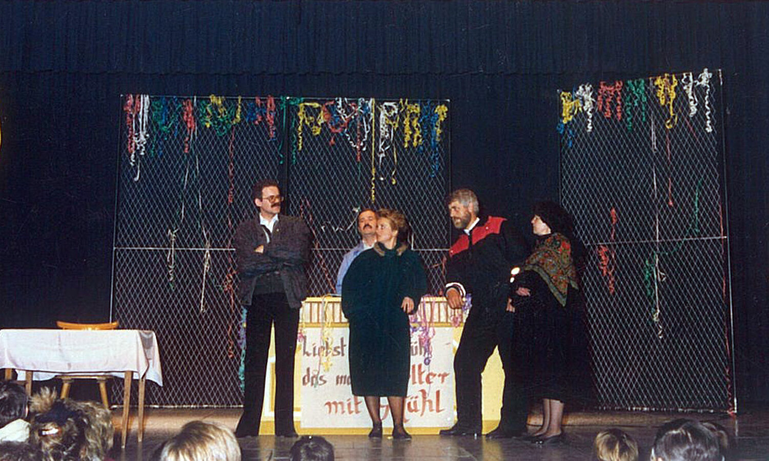 Auf der Bühne: Burgmann Marin, Egarter Sigfried, Godani Giuseppe, Holzer Lisbeth, Holzer Walter, Joas Alois, Mairginter Peppe, Marsilli Steinmair Imelda, Mühlmann Hans-Peter, Neunhäuserer Manfred, Niederwolfsgruber Paul, Oberhofer Annemarie, Schraffl Christine, Schäfer Irma, Schäfer Hans, Soniok Heini, Trojer Walter, Trojer Herbert, Tschurtschenthaler Josef, Tundo Vera